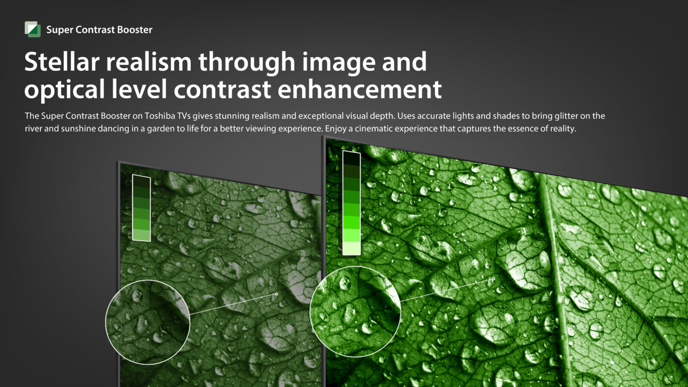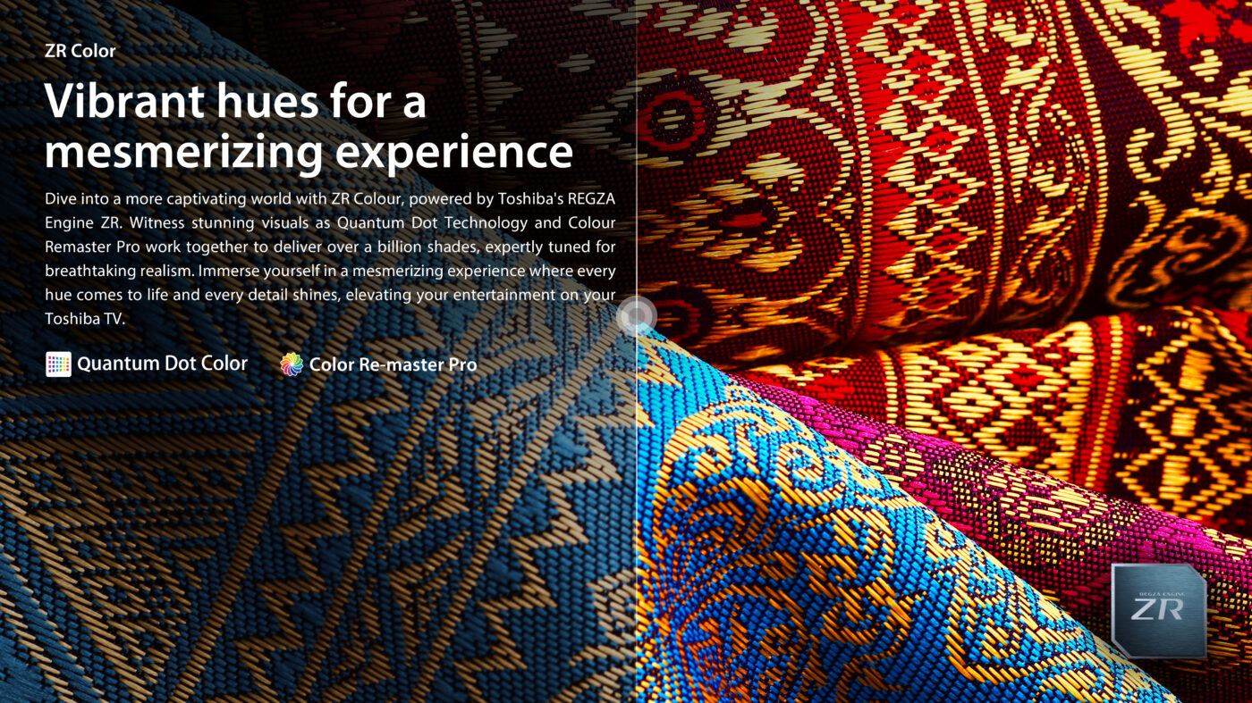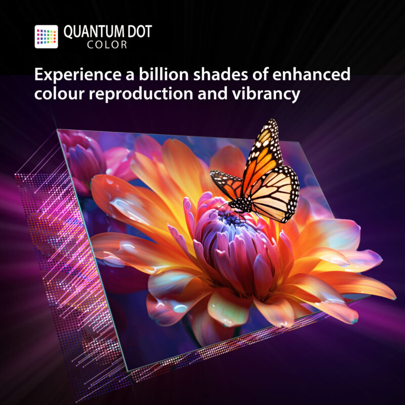 Toshiba’s Quantum Dot Technology creates vivid, lifelike colors.it delivers over a billion shades of color that stay realistic. Immerse yourself in an exciting and authentic watching experience, with every detail and nuance heightened.